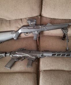 Ruger’s PC Carbine rifle features interchangeable magazine wells for use of common Ruger and Glock magazines. Its Dead blow action features a custom tungsten dead blow weight that shortens bolt travel and reduces felt recoil and muzzle rise. The cold hammer-forged, chrome-moly steel barrel is also heavy contoured with fluting. The durable, glass-filled nylon synthetic stock features sling swivel studs, soft rubber buttpad with spacers, and the grip has a proprietary texture for enhanced control. Its CNC-milled aerospace-grade 7075-T6 aluminum billet receiver includes an integrated Picatinny rail and adjustable ghost ring rear and blade front sights. The PC Carbine also has a light, crisp trigger pull and ambidextrous controls. This model has 1/2″-28 threads along with an included thread protector. It ships with SR-Series Pistol and Security-9 magazine well installed, and includes an additional magazine well accepting Glock magazines. NOTE: Older Glock magazines that feature only one magazine latch slot may still be used with the PC Carbine, but the magazine release button must remain on the left side of the rifle as shipped from the factory as the magazine will not properly lock into the magazine well.